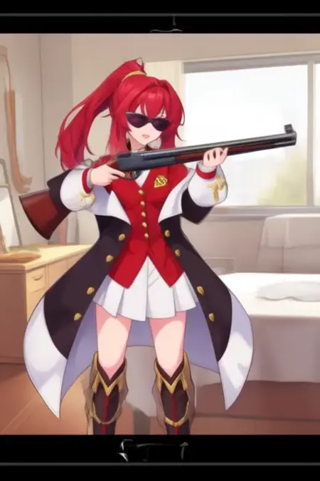 触发词:Ange Katrina,动漫风格女孩。图像中的角色拥有一头鲜艳的红色长发,扎成高马尾并带有刘海,眼睛是醒目的蓝色,身穿一套独特的服饰。上衣部分为一件红色夹克,配有白色和黑色装饰,胸前有一个显著的三角形徽章,夹克上有金色纽扣和白色领子。夹克内是一件高领白色衬衫。下装为一条白色短裙,搭配红色腰带,裙边有红色镶边,并配有棕色靴子,靴子上有金色装饰。