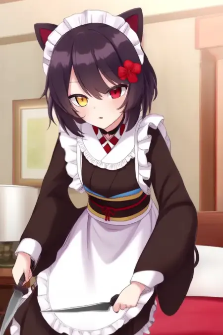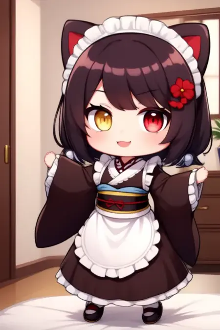 sample prompt:Inui Toko, anime-style girl. The image features an anime-style character with dark brown hair styled in a high ponytail adorned with a red flower accessory. The character has large, expressive eyes with one eye being yellow and the other red, giving them a unique and striking appearance. They are wearing a maid outfit consisting of a long white apron with a black collar and a brown dress with a red ribbon tied around the waist,(she is dancing:2.5), (chibi Nendoroid:3.5) in bedroom.