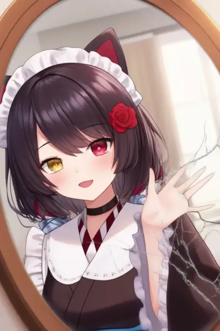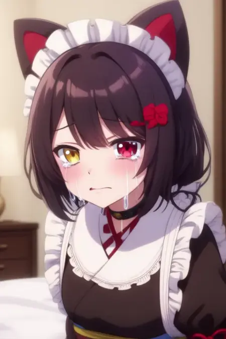 Trigger Word:Inui Toko, anime-style girl. The image features an anime-style character with dark brown hair styled in a high ponytail adorned with a red flower accessory. The character has large, expressive eyes with one eye being yellow and the other red, giving them a unique and striking appearance. They are wearing a maid outfit consisting of a long white apron with a black collar and a brown dress with a red ribbon tied around the waist