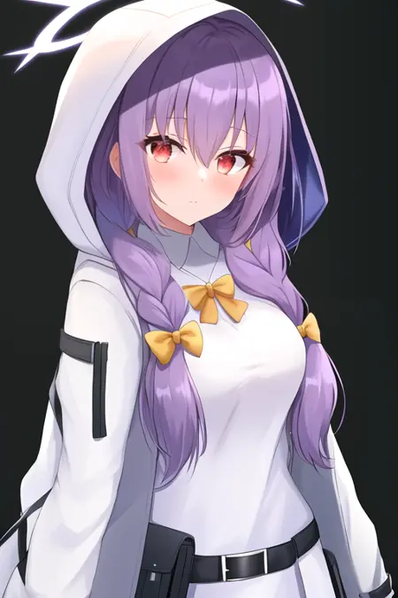 - The pruned character tags are long hair, purple hair, red eyes, halo, braid, twin braids, hair between eyes, bow, hair bow, breasts. You can add them into prompts when core features (e.g. hair color) of character is not so stable.