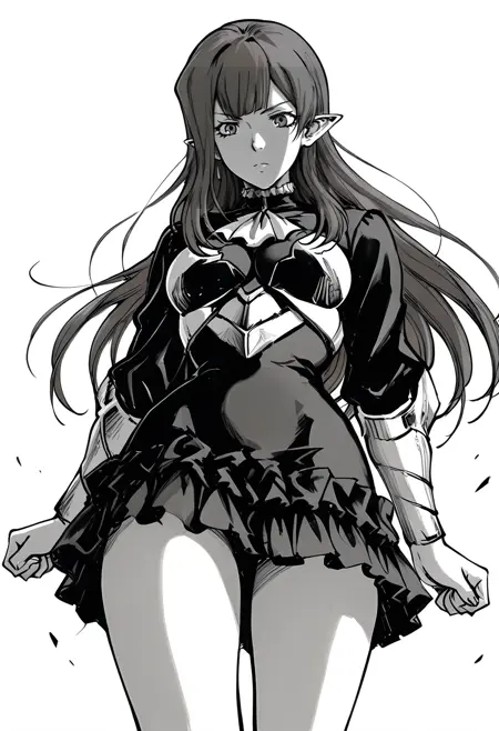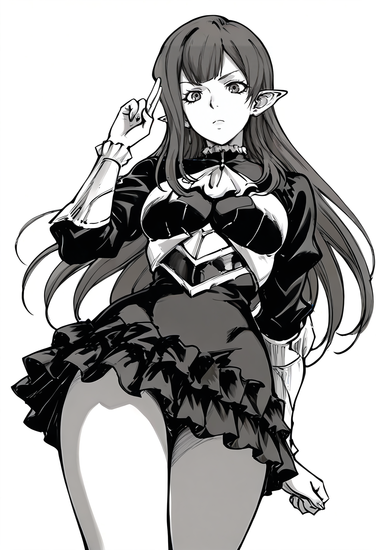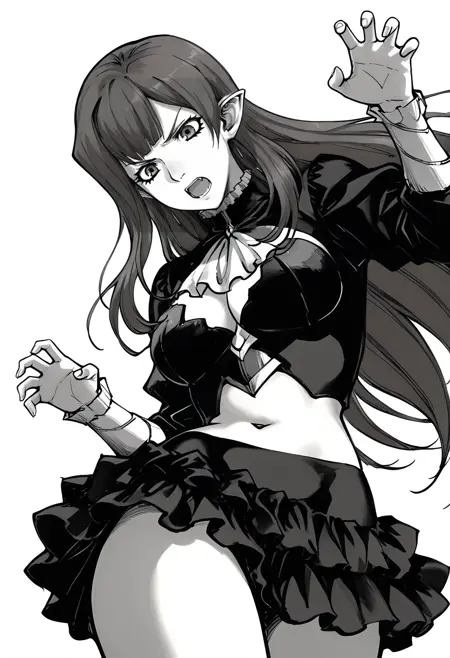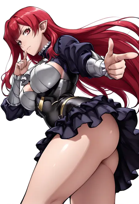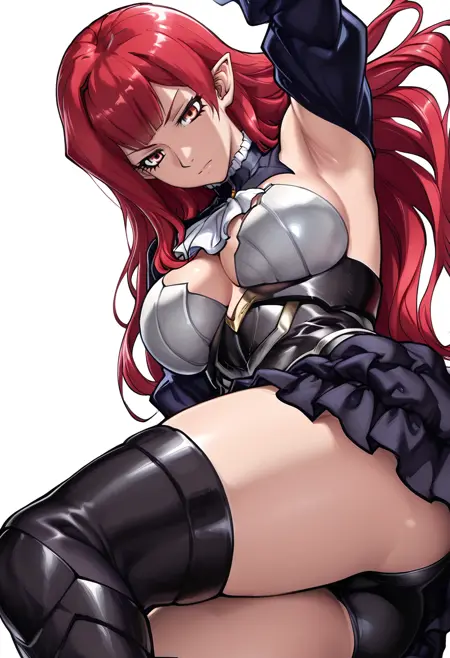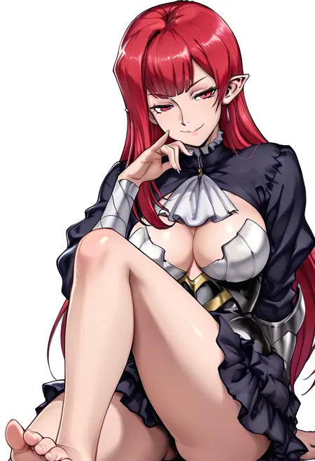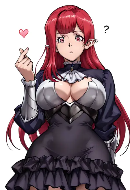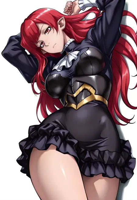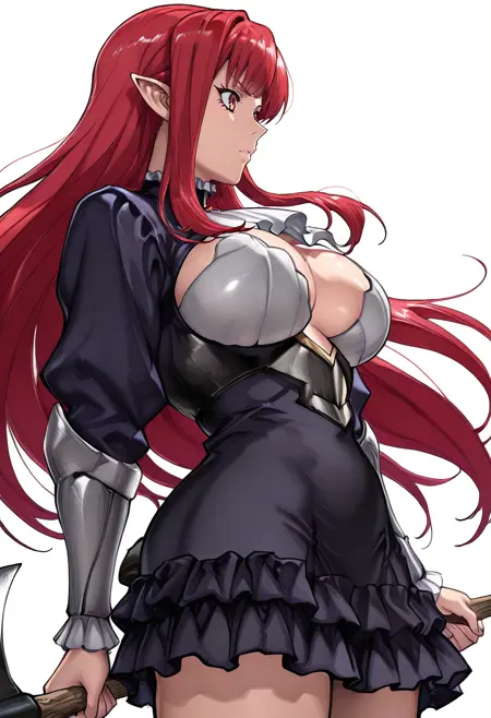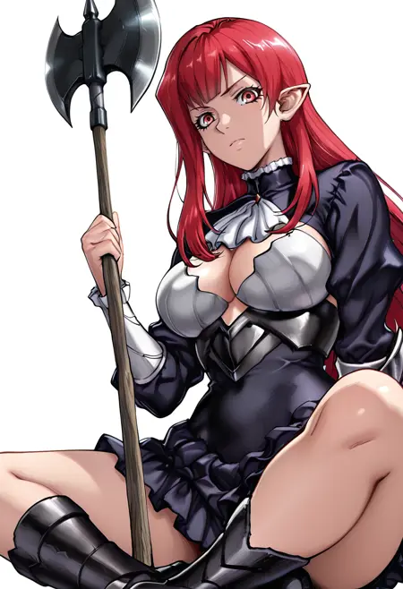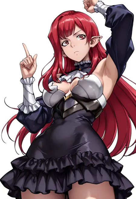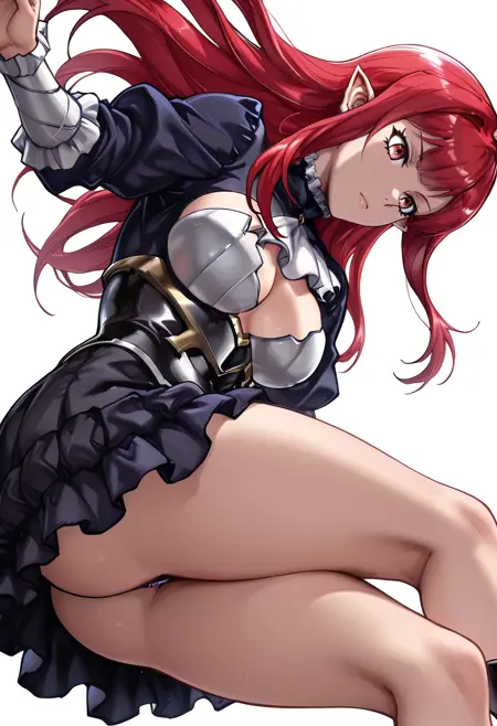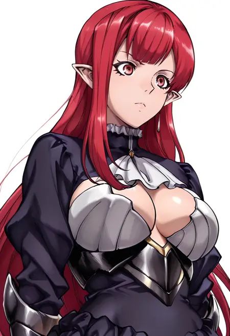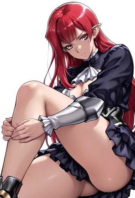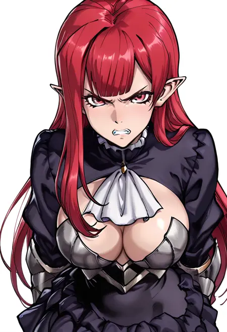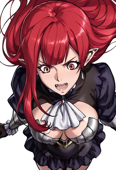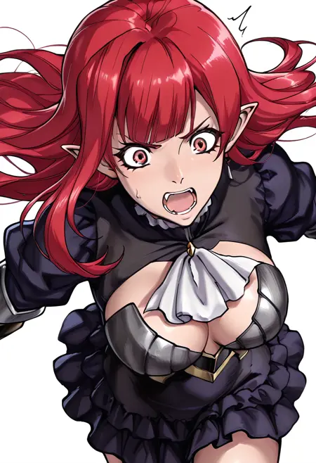 eleanora_il, 1girl, vampire, long hair, pointy ears, ascot, skirt, red eyes, red hair,