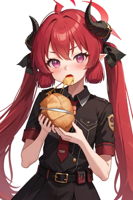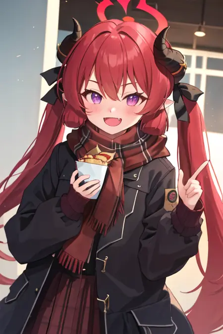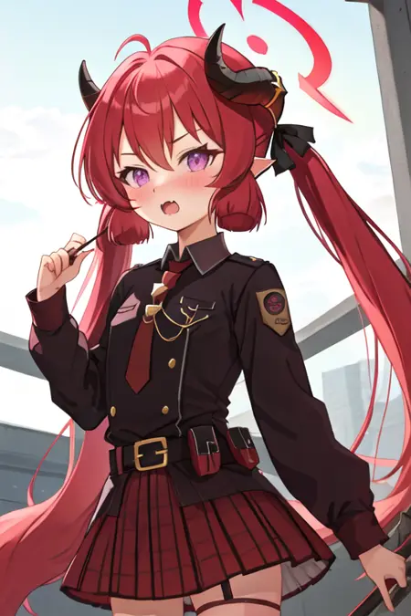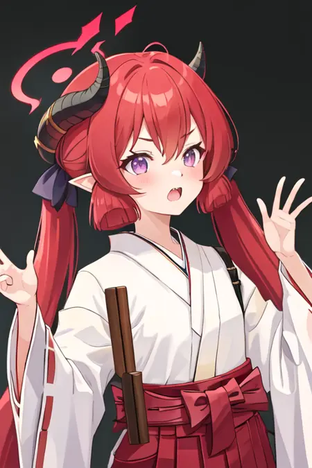 The trigger word is junko_bluearchive, and the pruned tags are red_hair, horns, long_hair, twintails, halo, demon_horns, pointy_ears, wings, hair_between_eyes, demon_wings, very_long_hair, black_horns, low_wings, purple_eyes, red_eyes, ribbon. When some features (e.g. hair color) are not so stable at some times, you can add these them into your prompt.