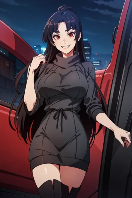 Helping words : red eyes , large breasts , black hair , bangs (not needed usually)