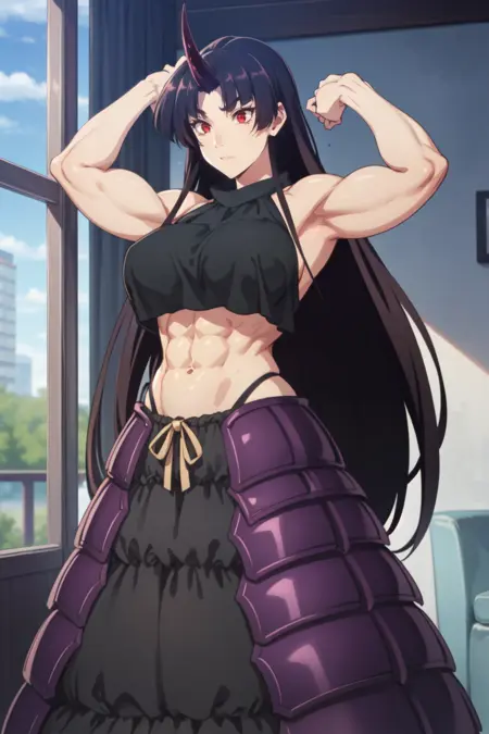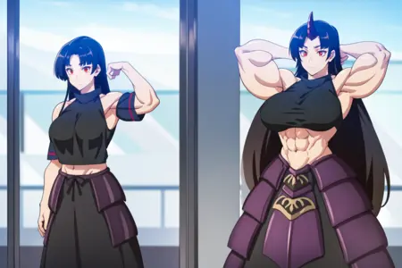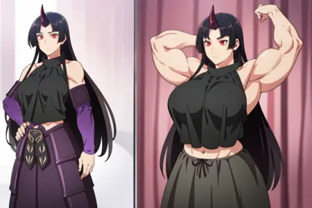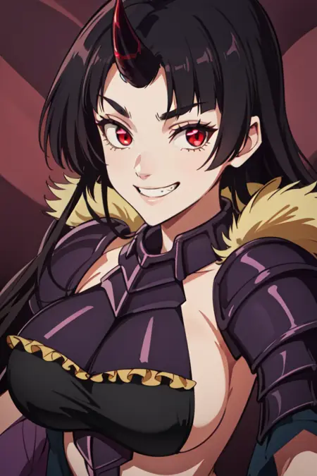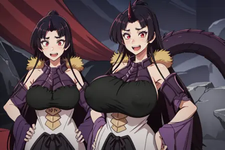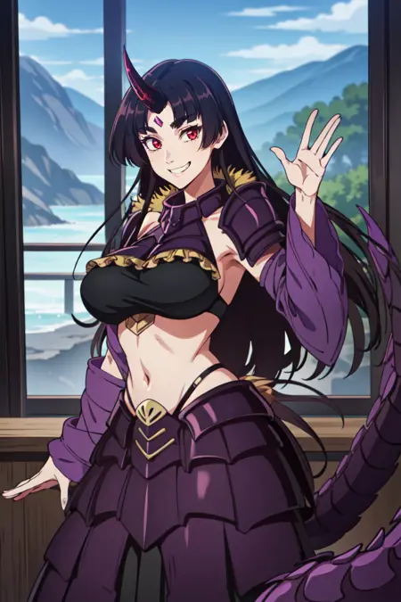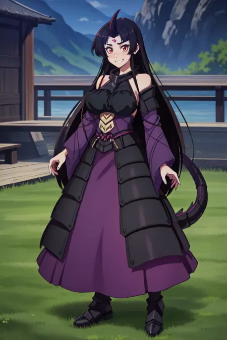 Dragon attire : purple armor , long skirt , black top , bare shoulders , single horn , purple dragon tail