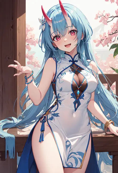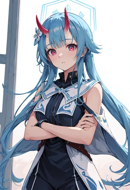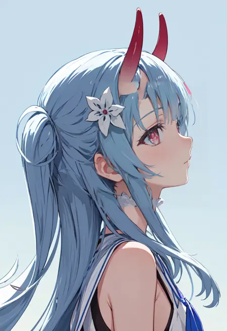 - 필터링된 캐릭터 태그는 뿔, 파란 머리, 긴 머리, 달빛, 붉은 눈, 머리 장식, 머리 꽃, 가슴, 작은 가슴, 매우 긴 머리, 옆머리 팁, 붉은 뿔입니다. 캐릭터의 핵심 특징(예: 머리색)이 안정적이지 않을 때 이 태그들을 프롬프트에 추가할 수 있습니다.