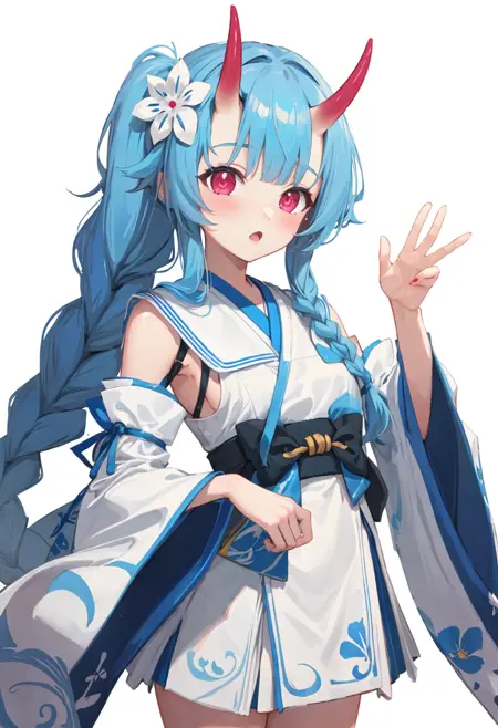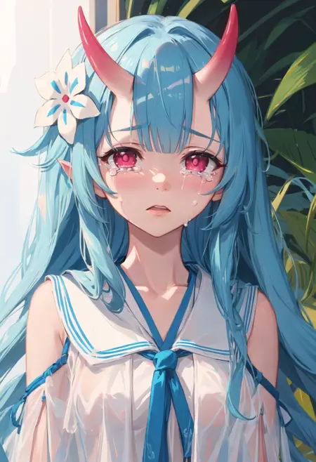 - 필터링된 캐릭터 태그는 뿔, 파란 머리, 긴 머리, 달빛, 붉은 눈, 머리 장식, 머리 꽃, 가슴, 작은 가슴, 매우 긴 머리, 옆머리 팁, 붉은 뿔입니다. 캐릭터의 핵심 특징(예: 머리색)이 안정적이지 않을 때 이 태그들을 프롬프트에 추가할 수 있습니다.