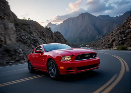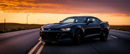 현대 머슬카: 유선형 실루엣, 공격적인 그릴, 미래주의적인 요소가 원시적인 힘의 본질과 결합된 형태.
