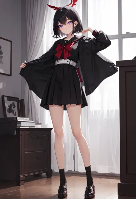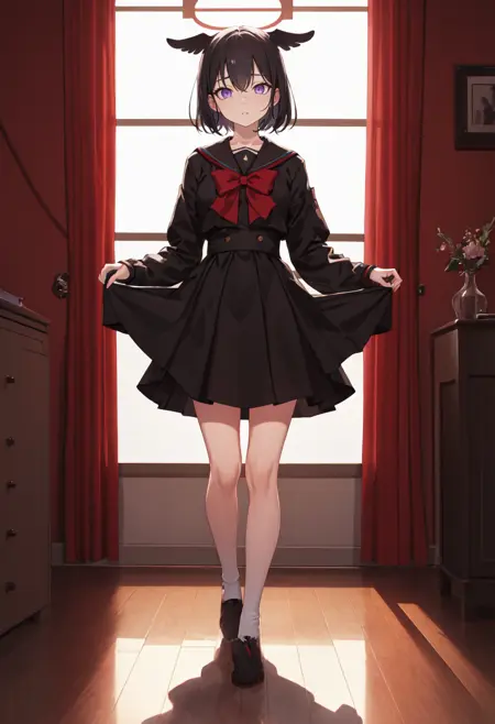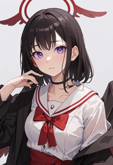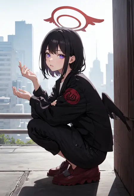 トリガーワードはmashiro_bluearchiveで、削除されたタグはblack_hair, short_hair, halo, purple_eyes, red_halo, wings, black_wings, feathered_wings, hairband, bowです。あるとき、特定の特徴(例:髪の色)が安定しない場合、これらをプロンプトに追加してください。