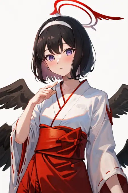 - 삭제된 캐릭터 태그는 검은 머리카락, 단발, 할로, 보라색 눈, 붉은 할로, 날개, 검은 날개, 깃털 날개, 머리띠, 리본입니다. 캐릭터의 핵심 특징(예: 머리색)이 안정적이지 않을 경우 이 태그들을 프롬프트에 추가할 수 있습니다.