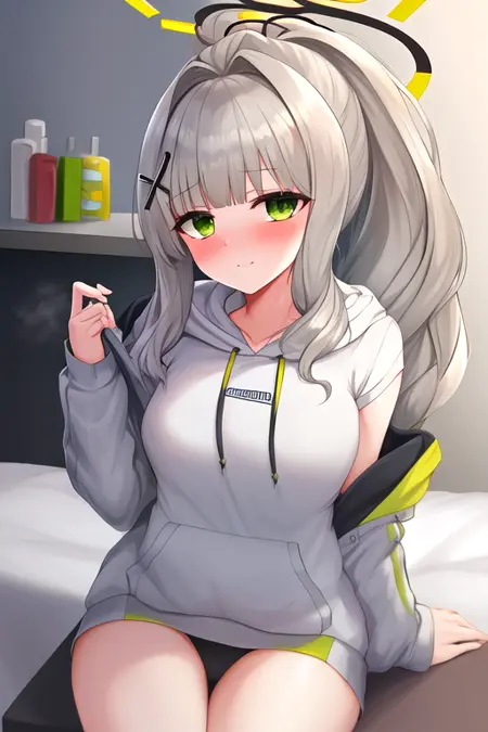 The trigger word is hare_bluearchive, and the recommended tags are best quality, masterpiece, highres, solo, {hare_bluearchive:1.15}, hair_ornament, bangs, green_eyes, halo, blush, long_hair, grey_hair, ponytail, hoodie, white_hair.