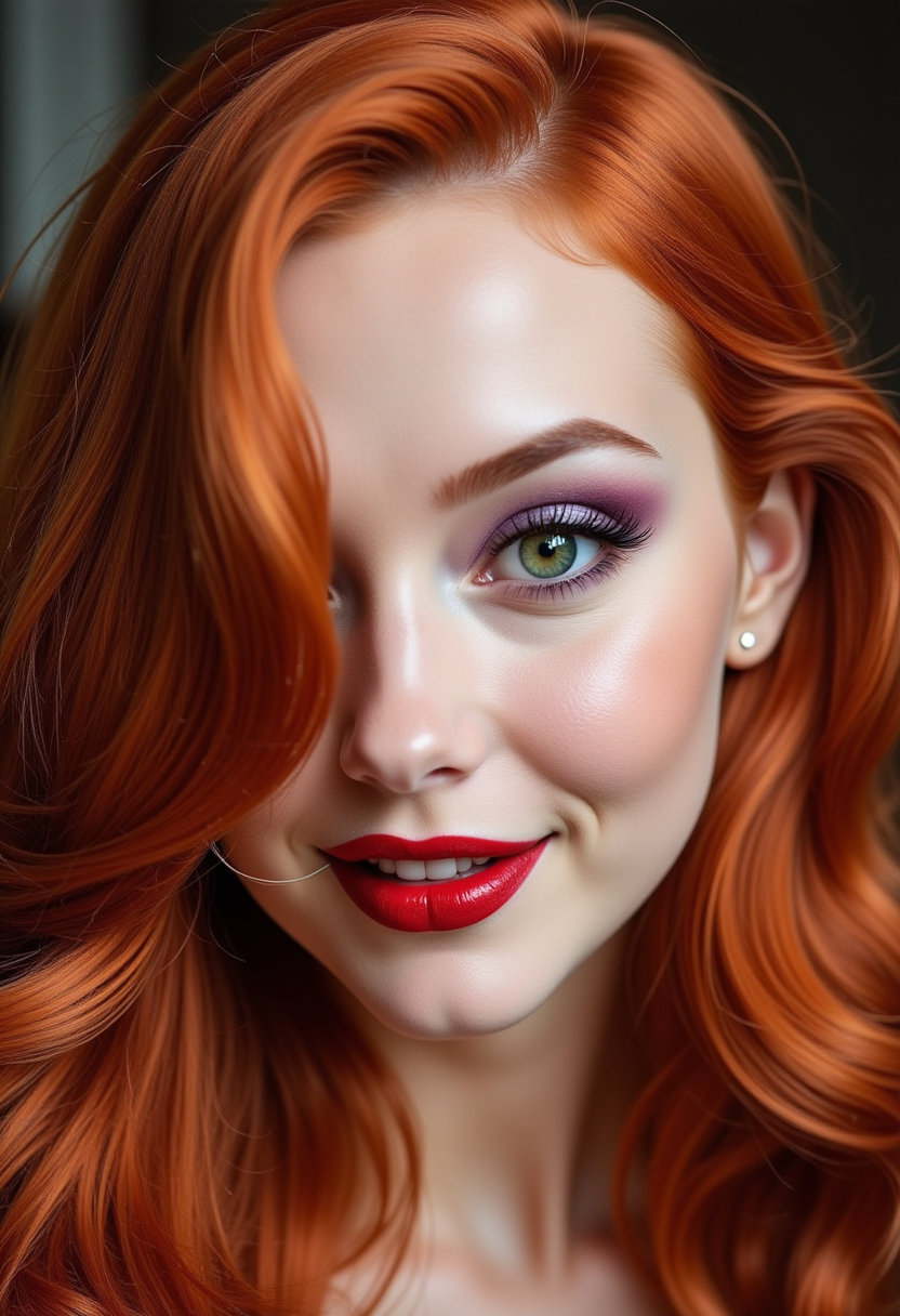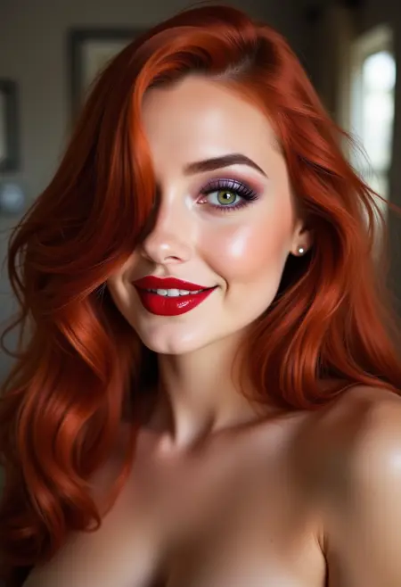 JessR, a statuesque tall, voluptuous, and amazingly gorgeous woman with a curvy and slender hourglass figure with a very narrow waist, broad hips and large breasts. She has fair skin and long, luxurious red hair styled in Hollywood Waves that cover her right eye. Her green eyes are heavy-lidded and seductive with long dark lashes and accented by shimmering lavender eye shadow. Her nose is fairly small, especially in relation to her full, red pouting lips. Her outfit is a red sequined strapless dress that reveals a lot of cleavage, and with a very low back, sweetheart neckline, and high thigh slit. In addition, she wears pink stilettos, elegant purple silk opera gloves, and gold stud earrings. The sequins of her dress sparkle under the stage lights.