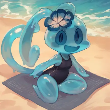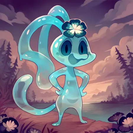 semi-anthro, slime girl, blue body, Translucent body, tail, long ears, dark blue eyes, flower head ornament,