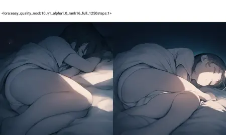 テストの結果、このLoRAは、さまざまなバージョンのnoobにおける構図の品質向上と手の修正に効果があることが確認されました(トレーニングベースモデルはnoob eps10です)。同じシードの画像には最小限の影響しか及ぼしません。