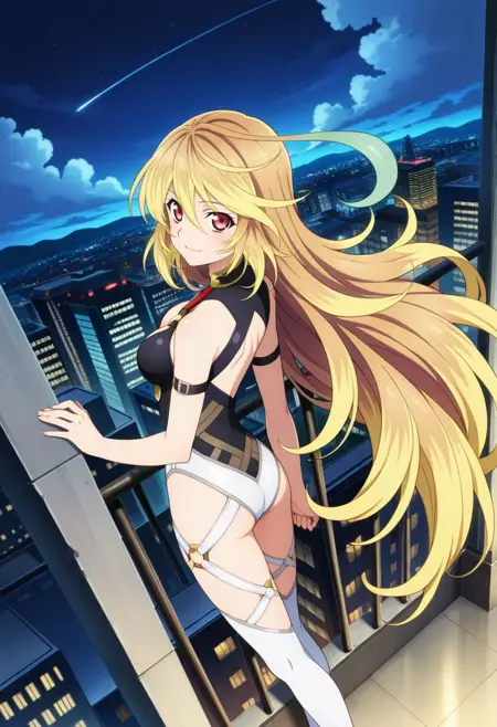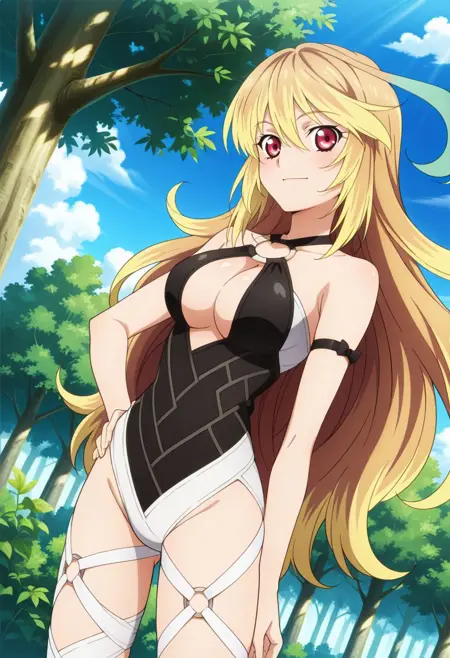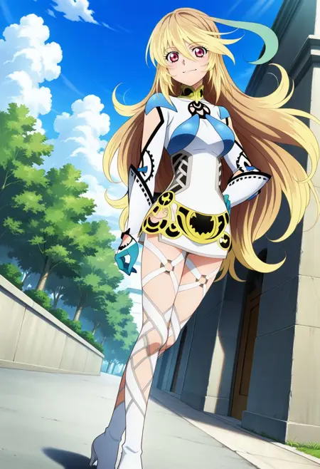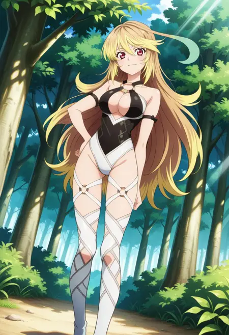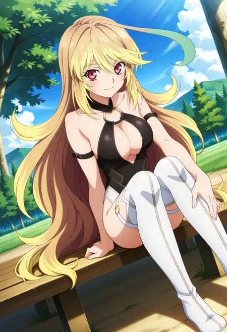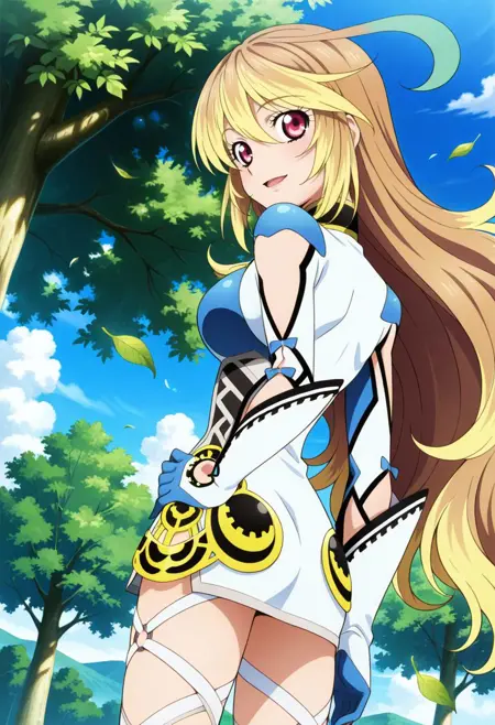milla2def, blonde hair, green ahoge, red eyes, very long hair, hair between eyes, two-tone hair,