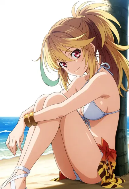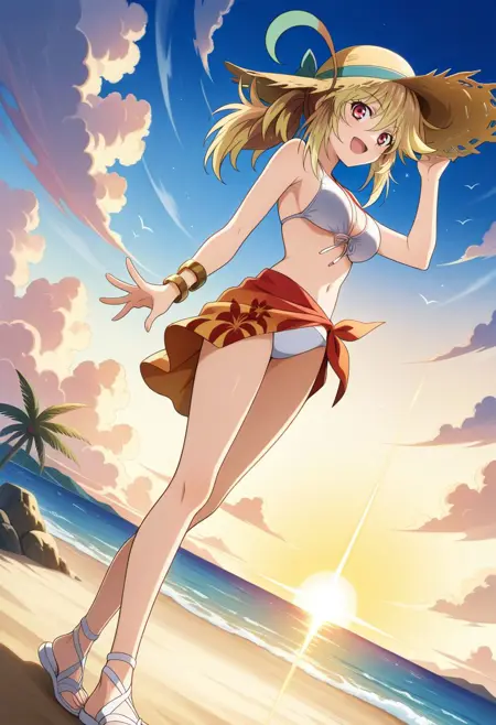 millaMz, blonde hair, gradient hair, green ahoge, ahoge, red eyes, ponytail, long hair, straw hat,