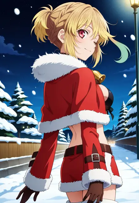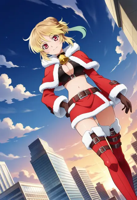 red skirt, miniskirt, santa dress, fur trim, red capelet, long sleeves, breast cutout, black bikini top, belt, brown gloves, choker, navel,