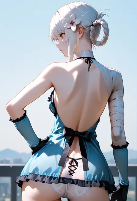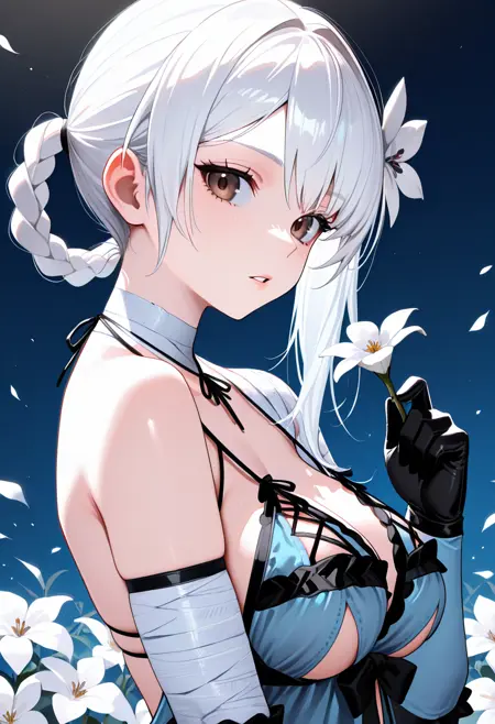 "KAINIR, 흰 머리카락, 갈색 눈, 비대칭 머리카락, 머리카락 꽃, 땋은 머리 고리, 붕대 감긴 목, 파란 네글리지, 언디부브 컷아웃, 붕대 감긴 팔, 파란 팔 보호대, 검은 장갑, 비대칭 하의, 붕대 감긴 다리, 한쪽 다리만 벌거벗음"