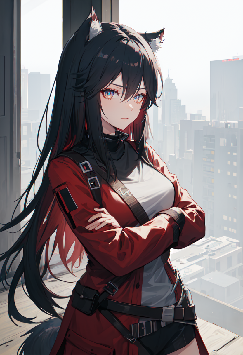 トリガーワードは texas_arknights で、削除されたタグは animal_ears, black_hair, long_hair, wolf_ears, animal_ear_fluff, hair_between_eyes, multicolored_hair, red_hair, wolf_girl, breasts, two-tone_hair, tail, wolf_tail, colored_inner_hair です。ある特徴(例:髪の色)が安定しない場合、これらをプロンプトに追加してください。