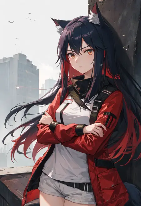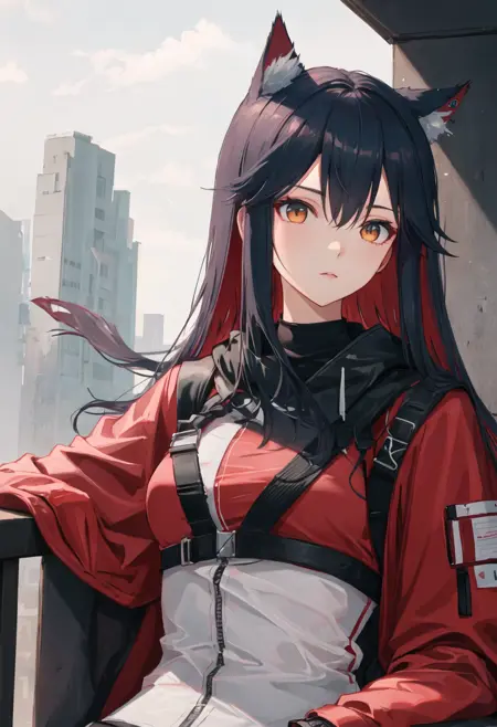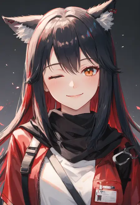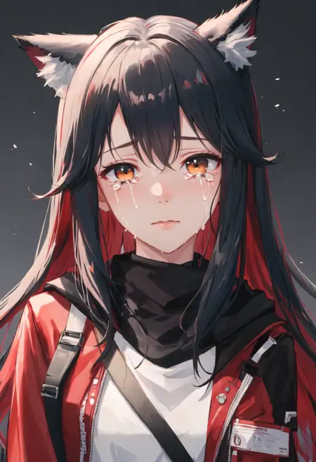 - The pruned character tags are animal ears, black hair, long hair, wolf ears, animal ear fluff, hair between eyes, multicolored hair, red hair, wolf girl, breasts, two-tone hair, tail, wolf tail, colored inner hair. You can add them into prompts when core features (e.g. hair color) of character is not so stable.