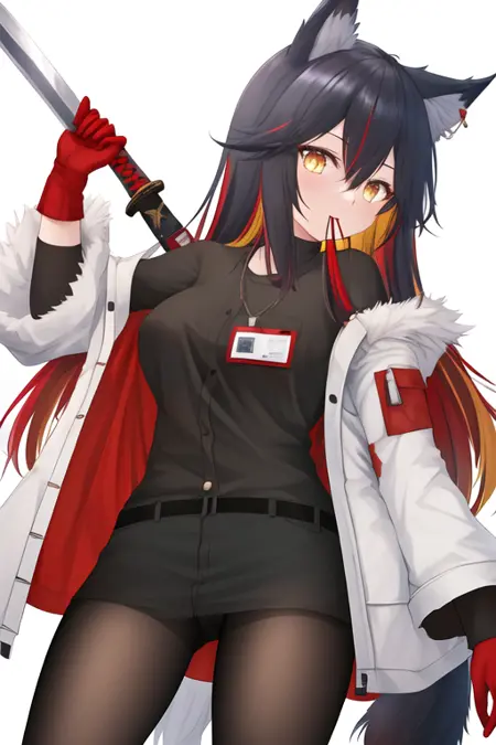 • The pruned character tags are animal ears, black hair, long hair, wolf ears, animal ear fluff, hair between eyes, multicolored hair, red hair, wolf girl, breasts, two-tone hair, tail, wolf tail, colored inner hair. You can add them into prompts when core features (e.g. hair color) of character is not so stable.
