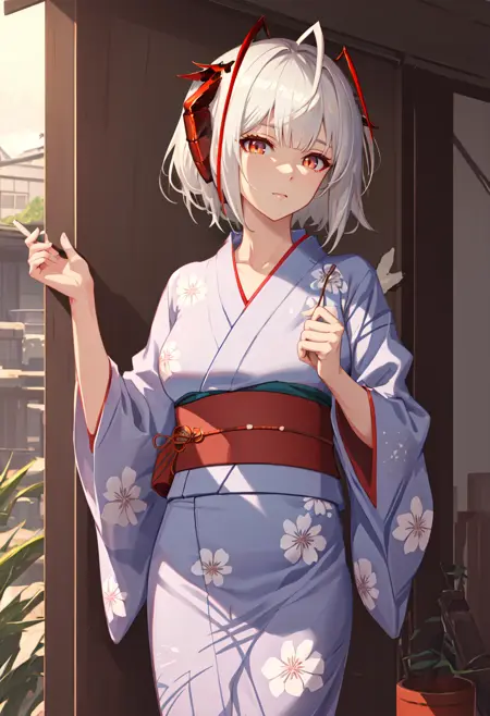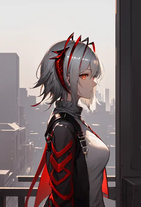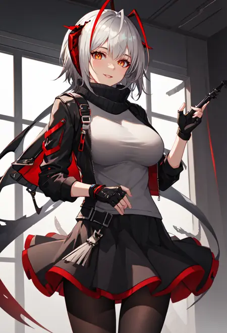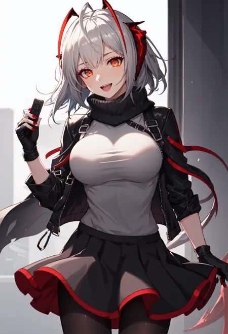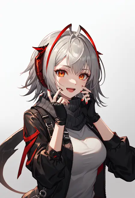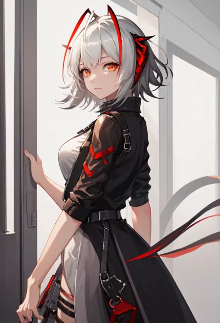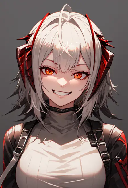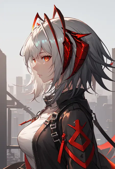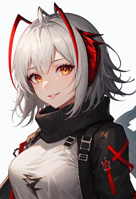 The trigger word is w_arknights, and the pruned tags are horns, short_hair, grey_hair, breasts, demon_horns, medium_breasts, red_eyes, ahoge, tail, multicolored_hair, orange_eyes. When some features (e.g. hair color) are not so stable at some times, you can add these them into your prompt.