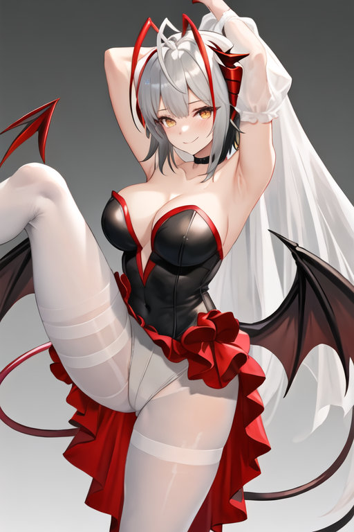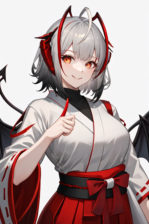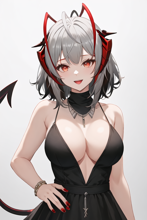 - The pruned character tags are horns, short hair, grey hair, breasts, demon horns, medium breasts, red eyes, ahoge, tail, multicolored hair, orange eyes. You can add them into prompts when core features (e.g. hair color) of character is not so stable.