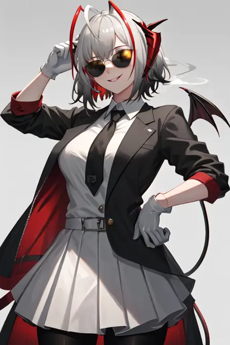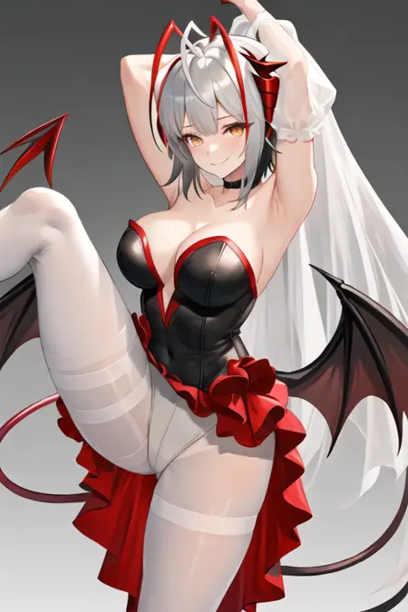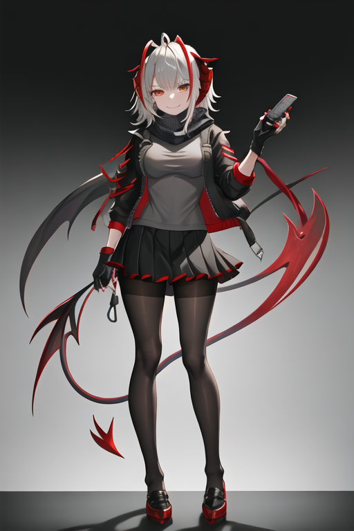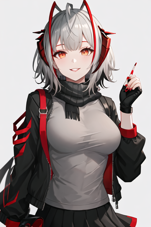 The trigger word is w_arknights, and the pruned tags are horns, short_hair, grey_hair, breasts, demon_horns, medium_breasts, red_eyes, ahoge, tail, multicolored_hair, orange_eyes. When some features (e.g. hair color) are not so stable at some times, you can add these them into your prompt.