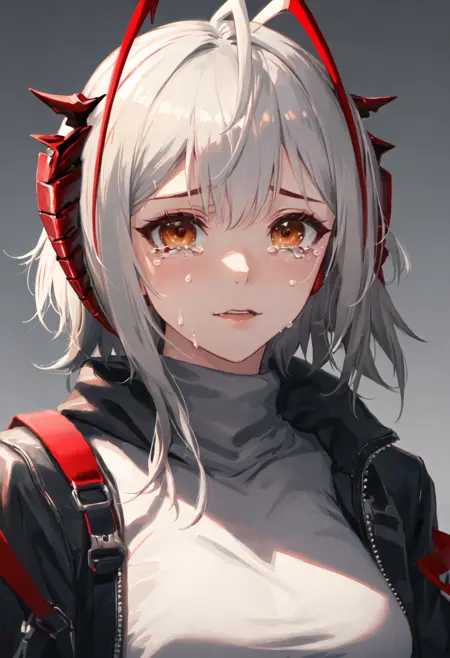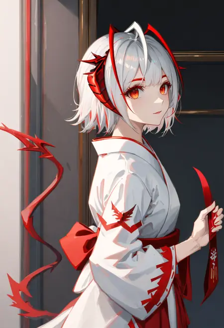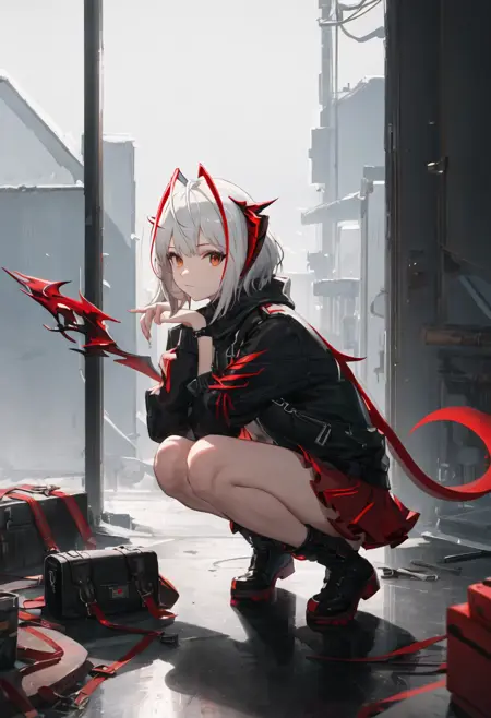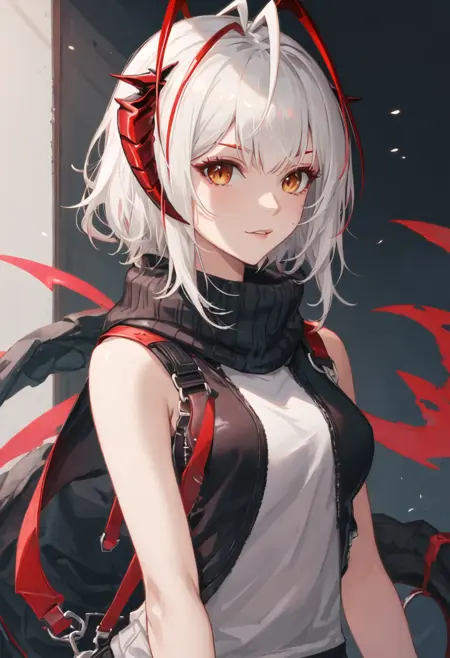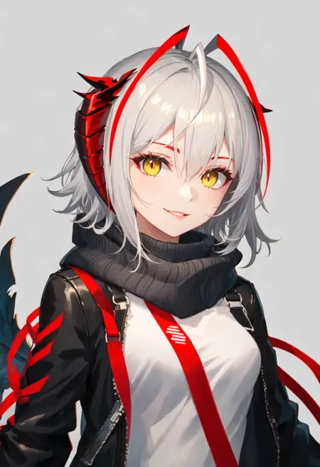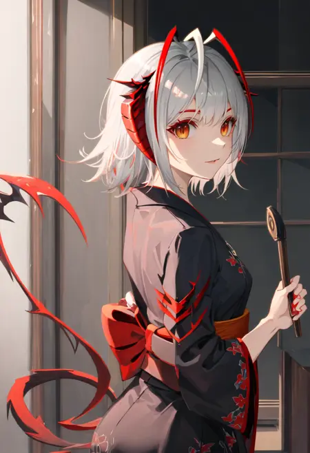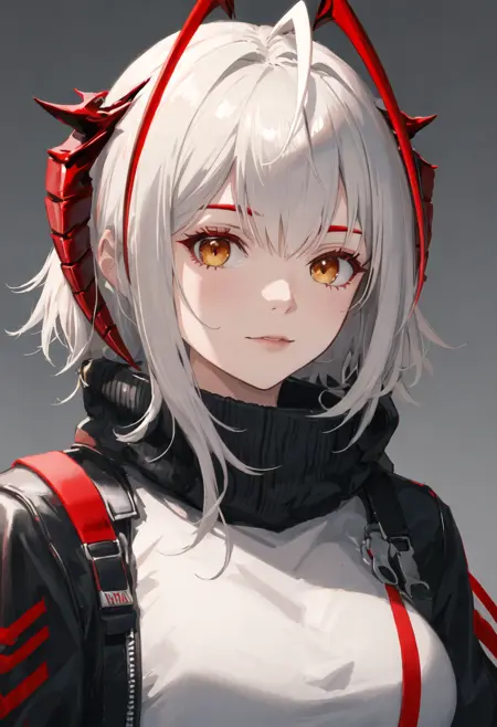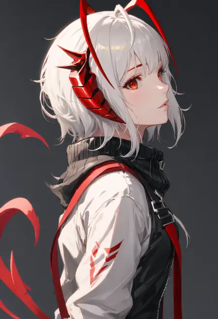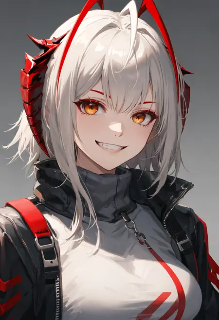 The trigger word is w_arknights, and the pruned tags are horns, short_hair, grey_hair, breasts, demon_horns, medium_breasts, red_eyes, ahoge, tail, multicolored_hair, orange_eyes. When some features (e.g. hair color) are not so stable at some times, you can add these them into your prompt.