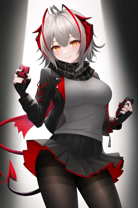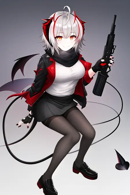 The trigger word is w_arknights, and the pruned tags are horns, short_hair, grey_hair, breasts, demon_horns, medium_breasts, red_eyes, ahoge, tail, multicolored_hair, orange_eyes. When some features (e.g. hair color) are not so stable at some times, you can add these them into your prompt.