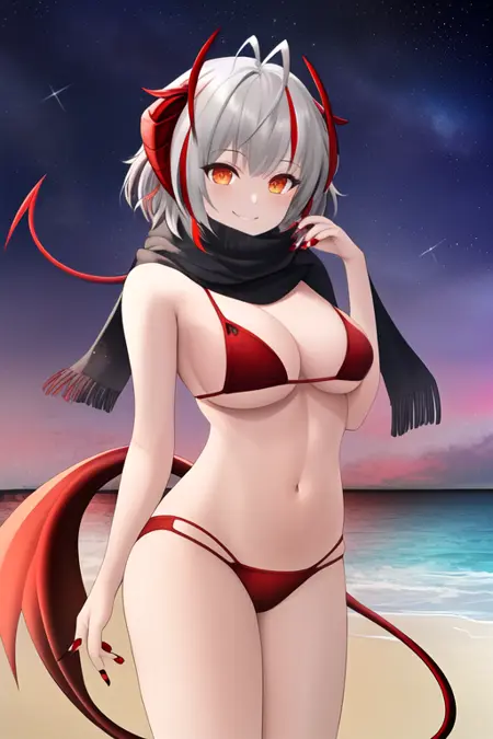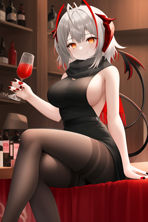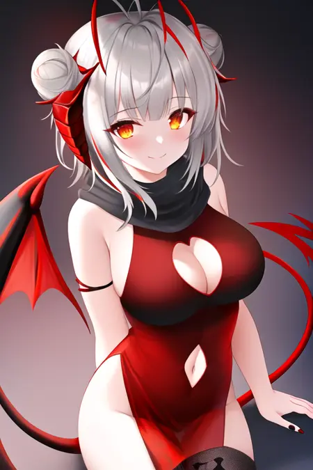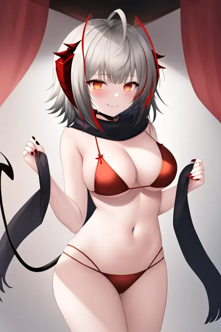 - The pruned character tags are horns, short hair, grey hair, breasts, demon horns, medium breasts, red eyes, ahoge, tail, multicolored hair, orange eyes. You can add them into prompts when core features (e.g. hair color) of character is not so stable.
