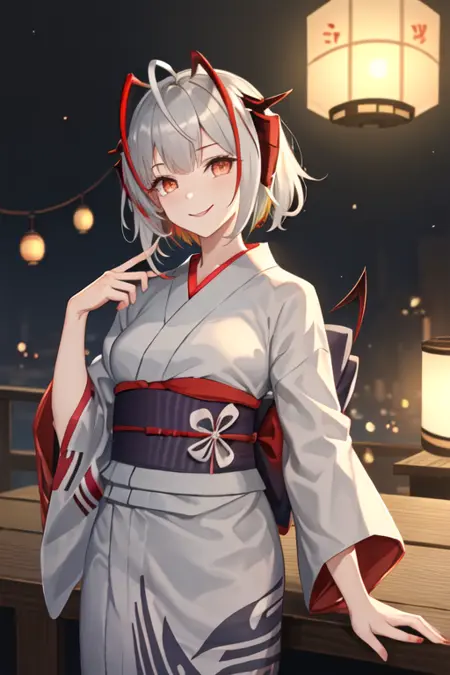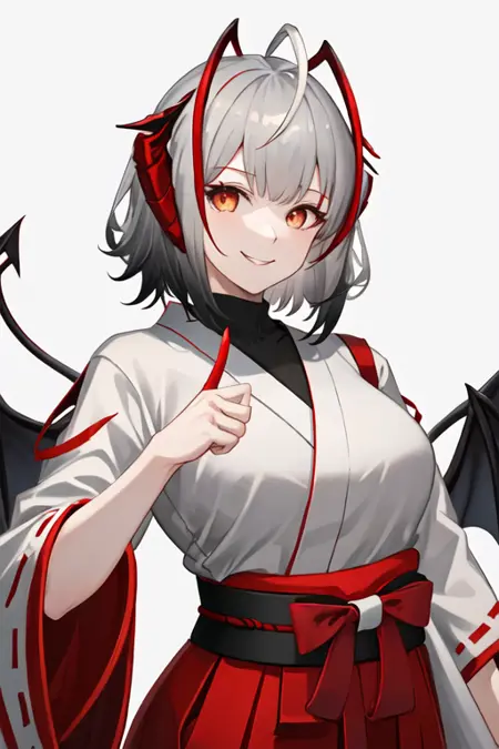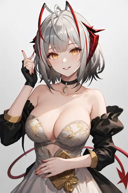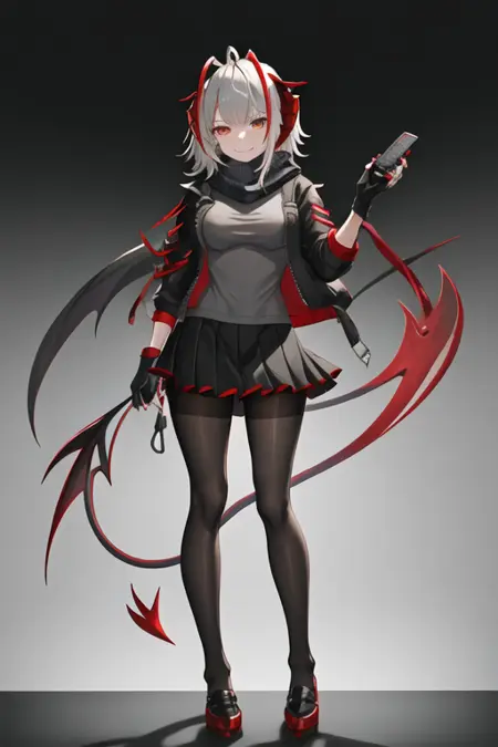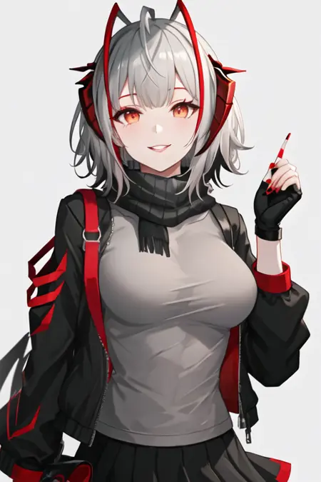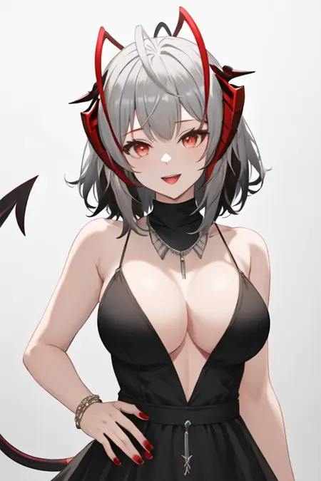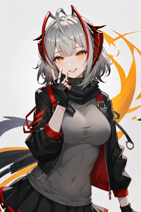 トリガーワードはw_arknights、削除されたタグはhorns, short_hair, grey_hair, breasts, demon_horns, medium_breasts, red_eyes, ahoge, tail, multicolored_hair, orange_eyesです。一部の特徴(例:髪の色)が時々安定しない場合、これらのタグをプロンプトに追加できます。