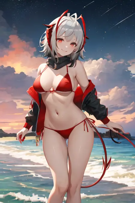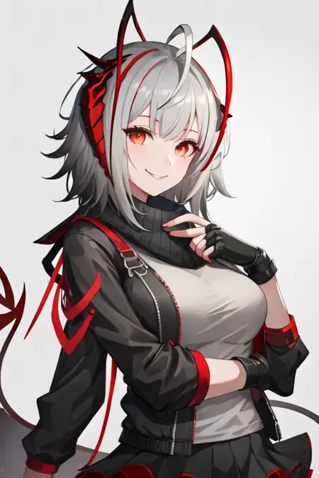 トリガーワードはw_arknights、削除されたタグはhorns, short_hair, grey_hair, breasts, demon_horns, medium_breasts, red_eyes, ahoge, tail, multicolored_hair, orange_eyesです。一部の特徴(例:髪の色)が時々安定しない場合、これらのタグをプロンプトに追加できます