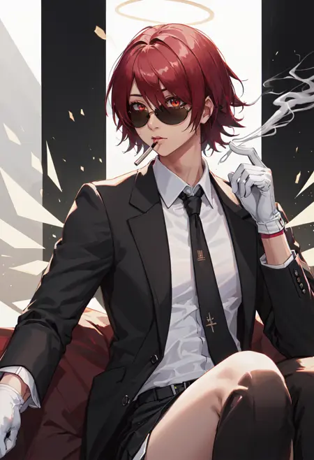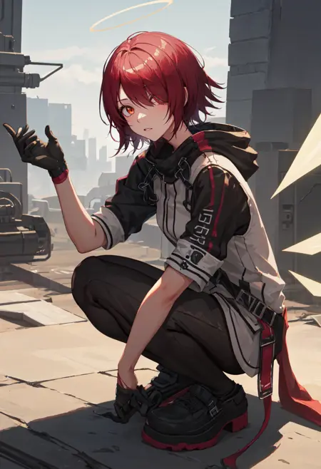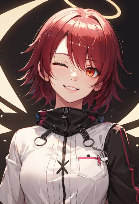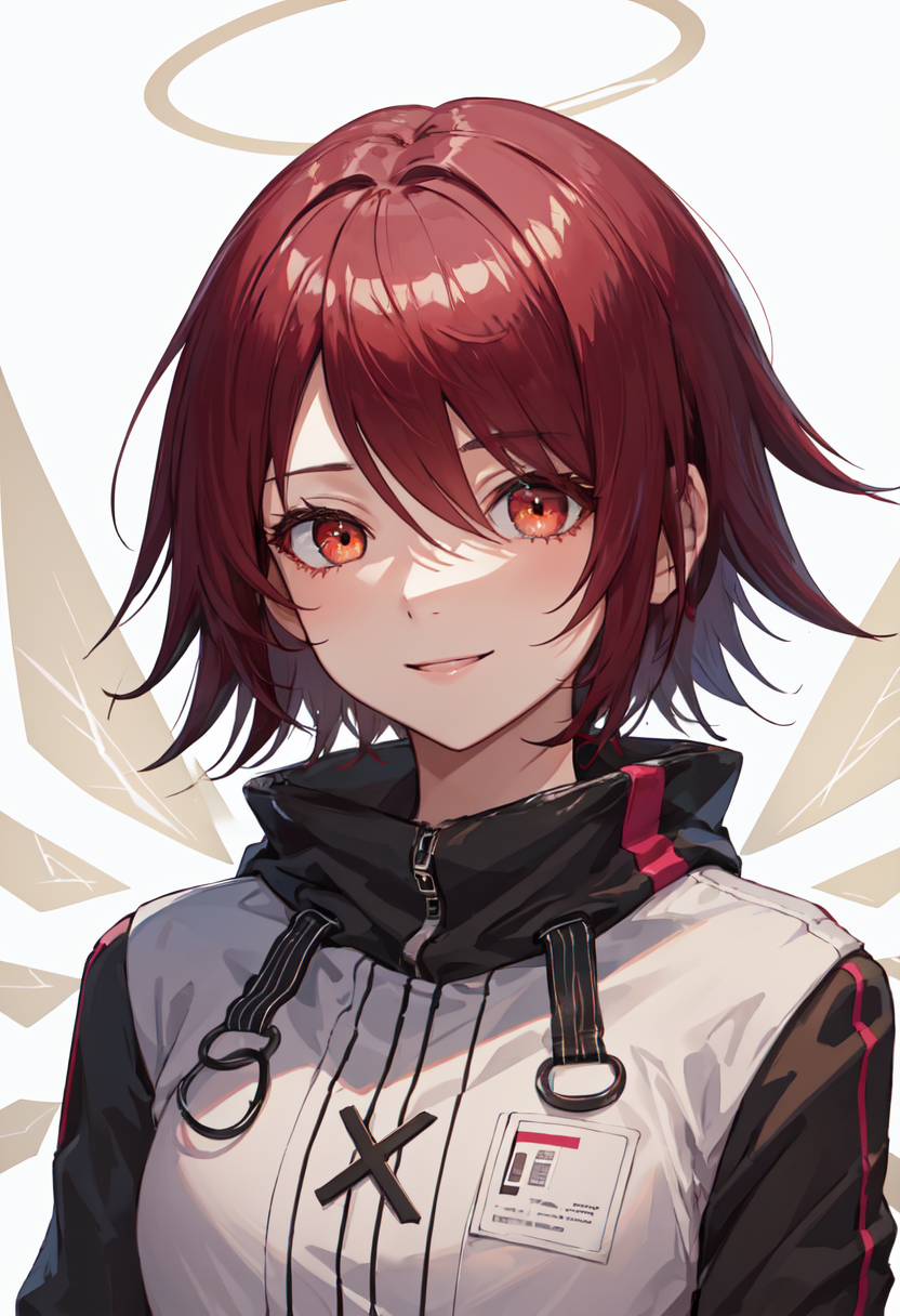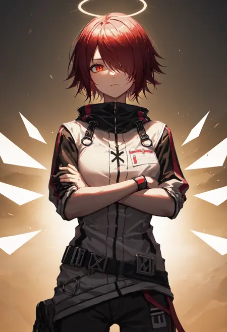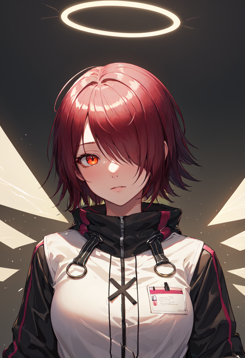 The trigger word is exusiai_arknights, and the pruned tags are red_hair, halo, short_hair, wings, hair_over_one_eye, red_eyes, detached_wings, orange_eyes, breasts. When some features (e.g. hair color) are not so stable at some times, you can add these them into your prompt.
