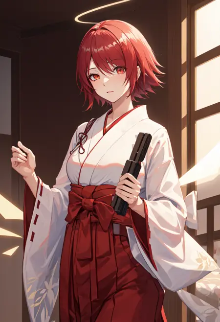 • The pruned character tags are red hair, halo, short hair, wings, hair over one eye, red eyes, detached wings, orange eyes, breasts. You can add them into prompts when core features (e.g. hair color) of character is not so stable.
