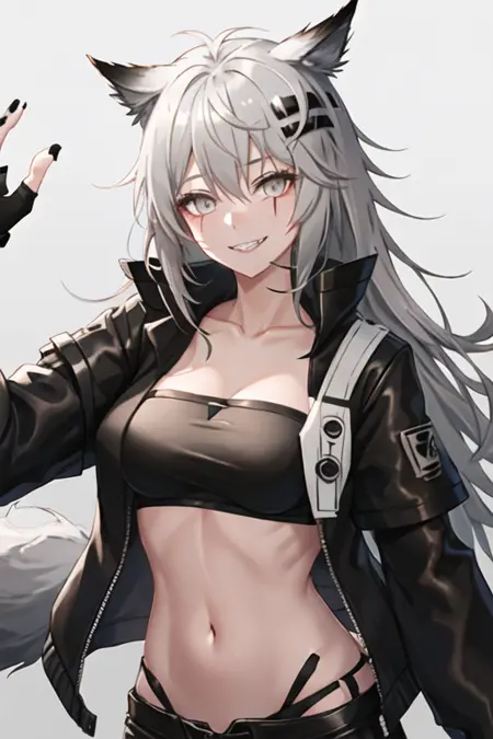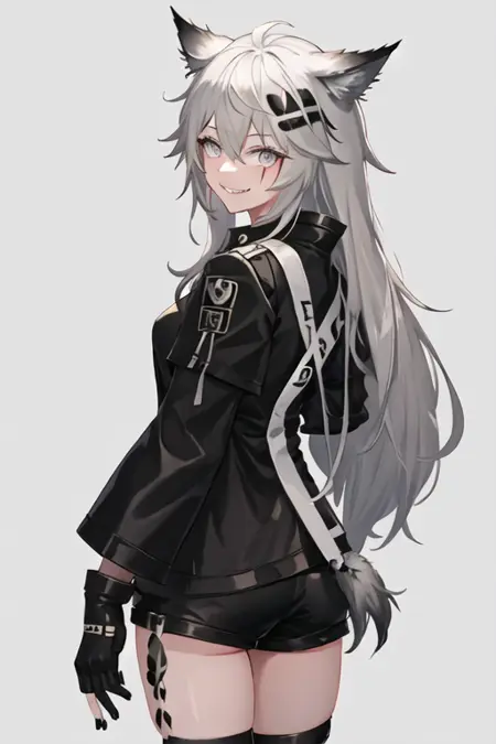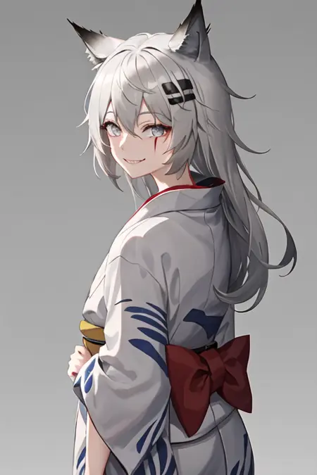 - The pruned character tags are animal ears, wolf ears, long hair, scar across eye, hair ornament, hairclip, grey hair, hair between eyes, scar on face, grey eyes, white hair, very long hair, tail. You can add them into prompts when core features (e.g. hair color) of character is not so stable.