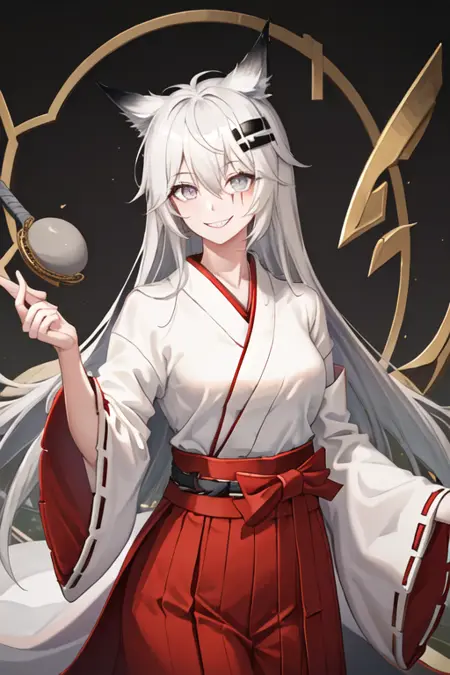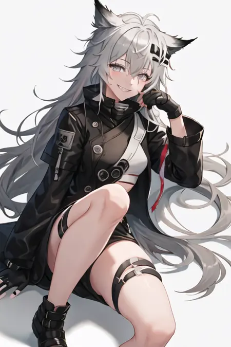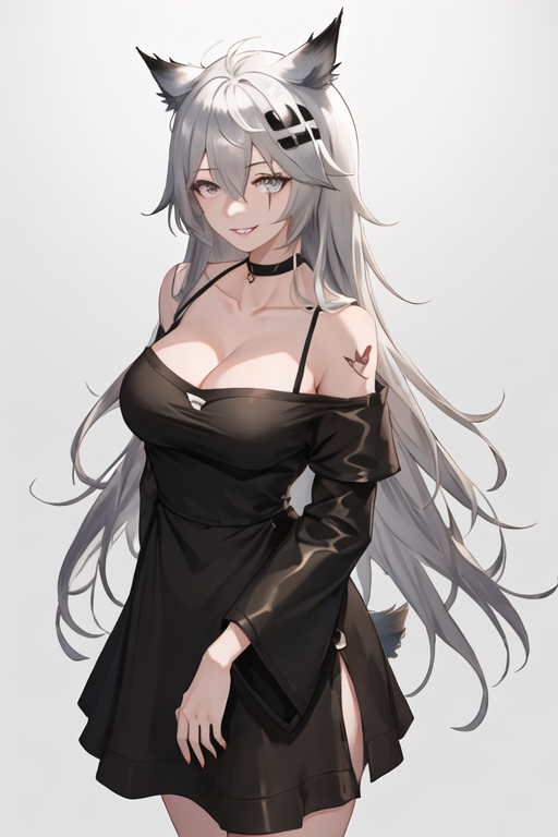 - The pruned character tags are animal ears, wolf ears, long hair, scar across eye, hair ornament, hairclip, grey hair, hair between eyes, scar on face, grey eyes, white hair, very long hair, tail. You can add them into prompts when core features (e.g. hair color) of character is not so stable.
