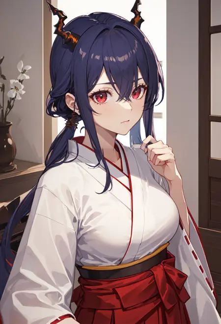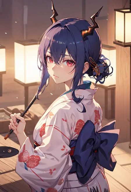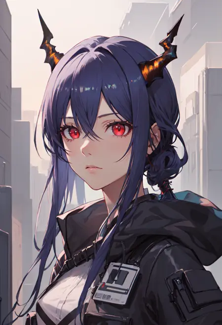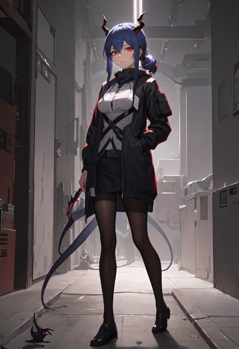 - The pruned character tags are horns, blue hair, dragon horns, long hair, red eyes, hair between eyes, breasts, dragon tail, tail, medium breasts, twintails, sidelocks. You can add them into prompts when core features (e.g. hair color) of character is not so stable.
