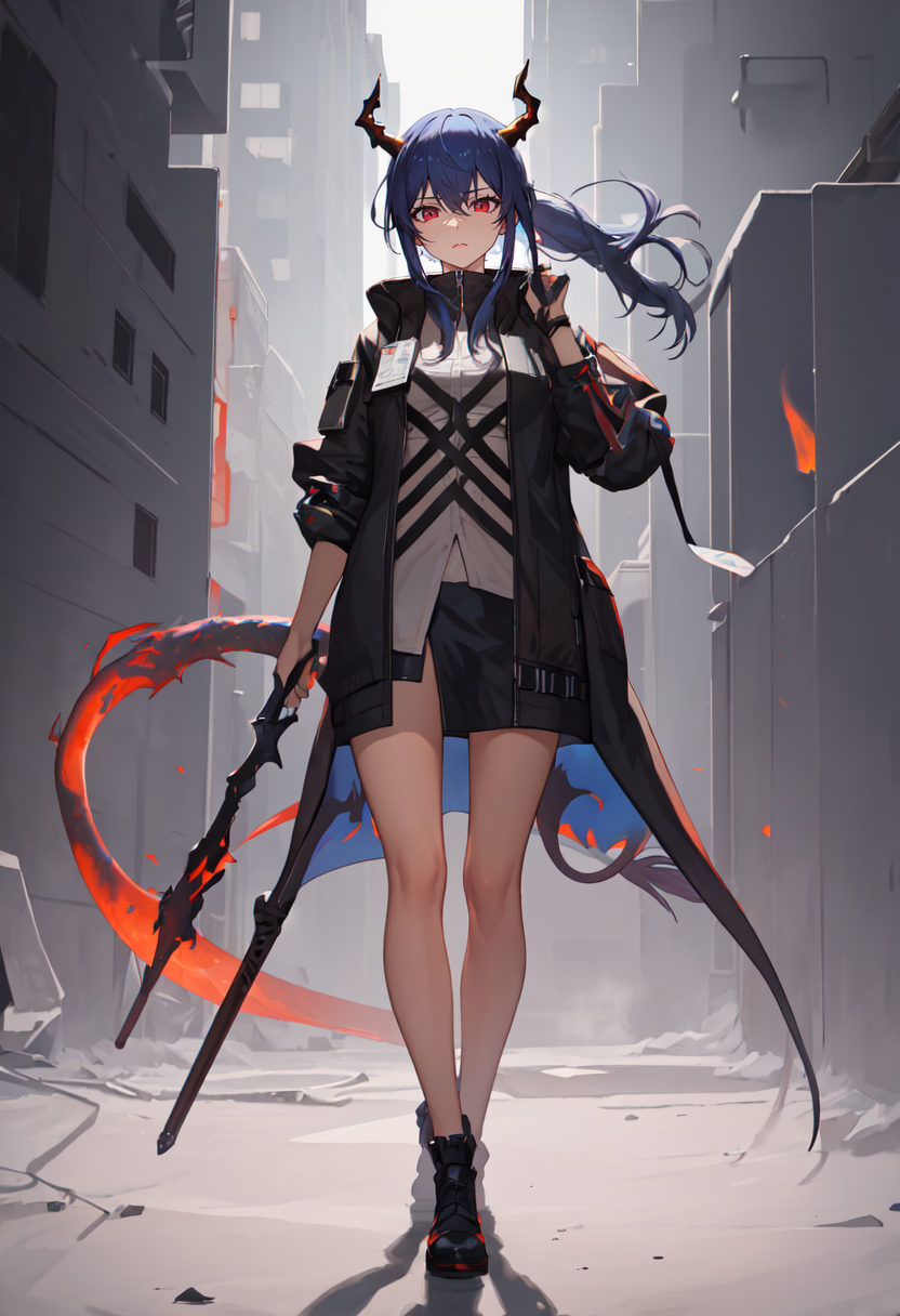 The trigger word is ch_en_arknights, and the pruned tags are horns, blue_hair, dragon_horns, long_hair, red_eyes, hair_between_eyes, breasts, dragon_tail, tail, medium_breasts, twintails, sidelocks. When some features (e.g. hair color) are not so stable at some times, you can add these them into your prompt.