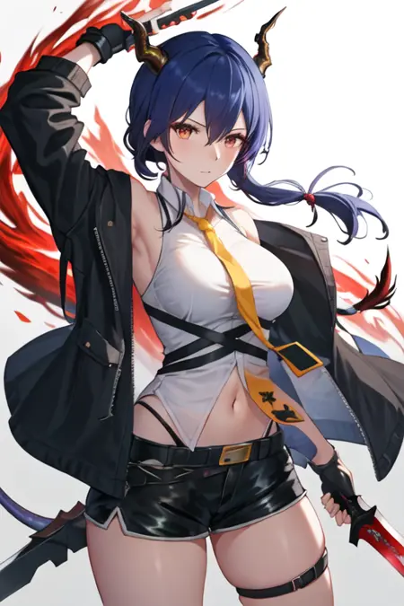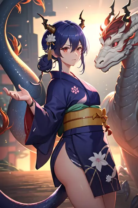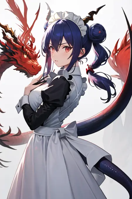 • The pruned character tags are horns, blue hair, dragon horns, long hair, red eyes, hair between eyes, breasts, dragon tail, tail, medium breasts, twintails, sidelocks. You can add them into prompts when core features (e.g. hair color) of character is not so stable.