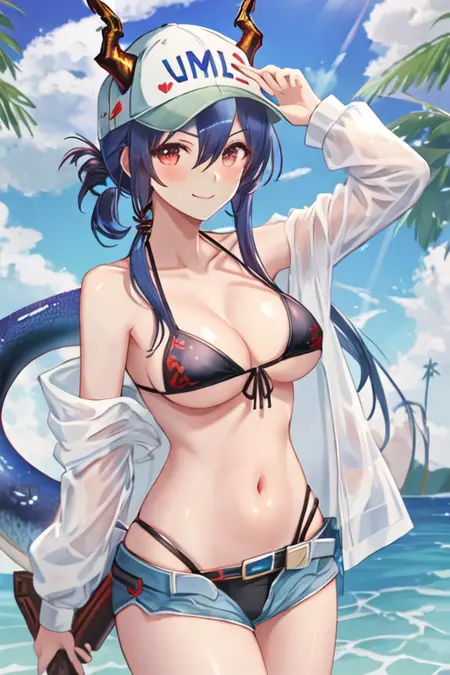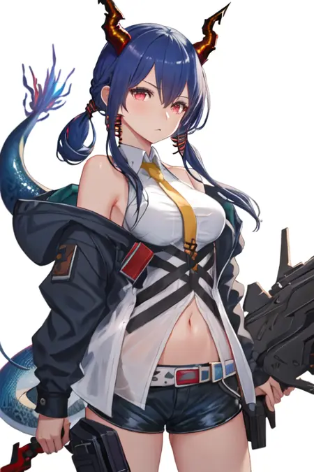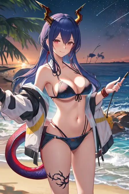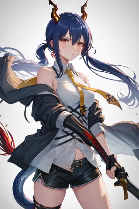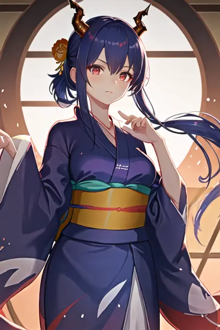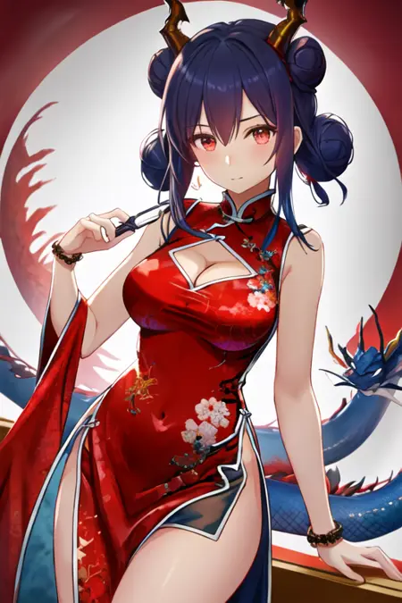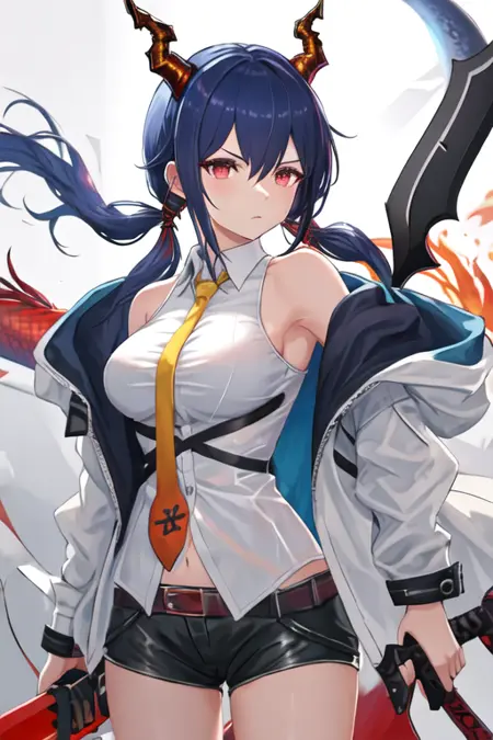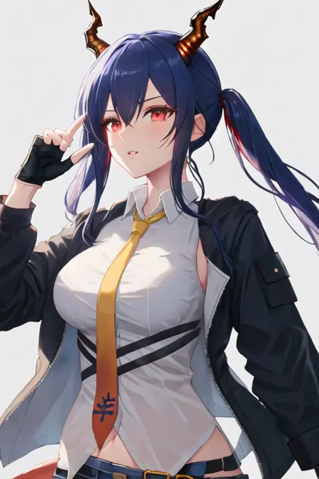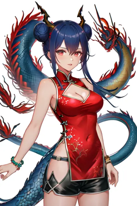 - The pruned character tags are horns, blue hair, dragon horns, long hair, red eyes, hair between eyes, breasts, dragon tail, tail, medium breasts, twintails, sidelocks. You can add them into prompts when core features (e.g. hair color) of character is not so stable.