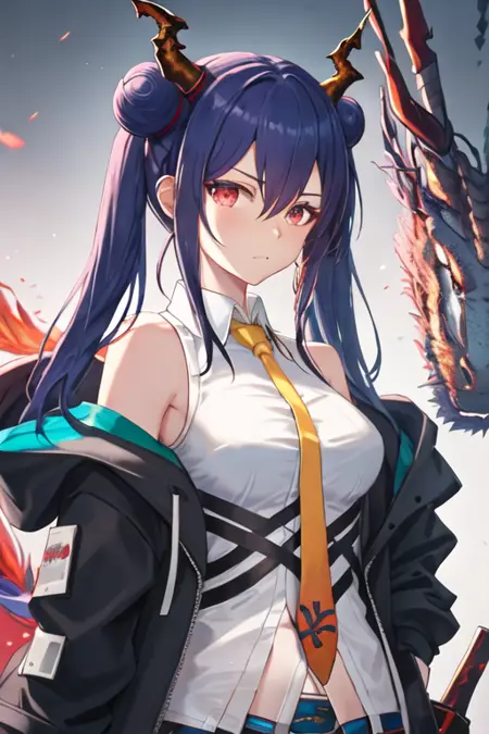 The trigger word is ch_en_arknights, and the pruned tags are horns, blue_hair, dragon_horns, long_hair, red_eyes, hair_between_eyes, breasts, dragon_tail, tail, medium_breasts, twintails, sidelocks. When some features (e.g. hair color) are not so stable at some times, you can add these them into your prompt.