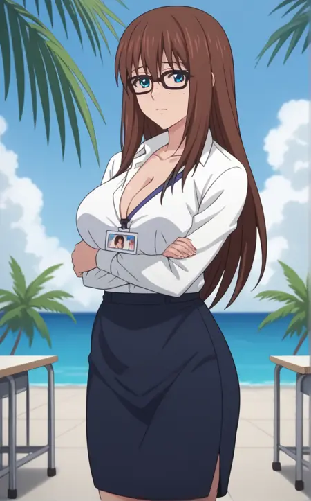 WhiteShirt_YukuhashiRena_ownwaifu, 1girl, brown hair, long hair, white shirt, glasses, freckles, black-framed eyewear, blue eyes, collared shirt, office lady, collarbone, long sleeves, cleavage, dress shirt, large breasts, id card, pencil skirt, black skirt, open shirt, open clothes, hair between eyes, shirt tucked in, blue ribbon, straight hair, long skirt,