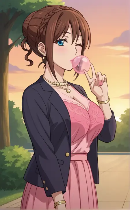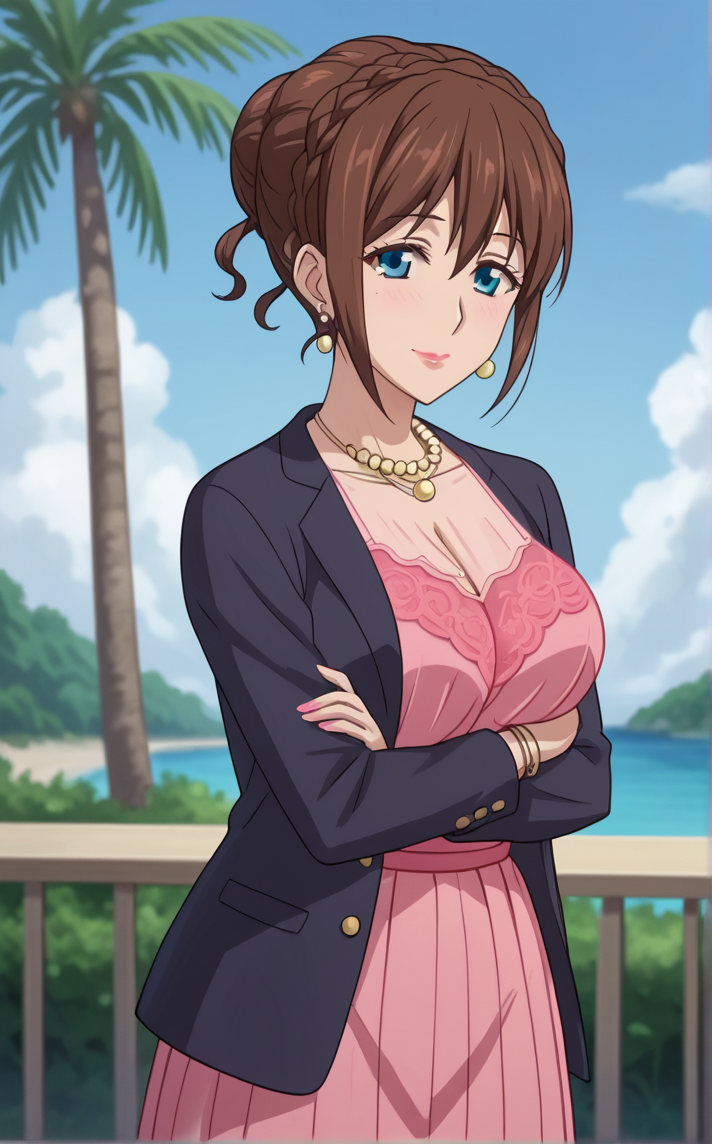 PinkJacketDress_YukuhashiRena_ownwaifu, 1girl, brown hair, jewelry, earrings, short hair, necklace, blue eyes, alternate hairstyle, hair up, braid, jacket, cleavage, pink dress, single hair bun, bracelet, ponytail, large breasts, mature female, breasts, sidelocks, crown braid, collarbone, lipstick, pearl necklace, pleated skirt, see-through, black jacket, dress, blazer, casual, hair between eyes, long skirt, open jacket, braided bun,