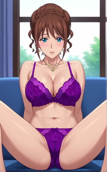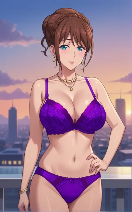 PurpleLingerie_YukuhashiRena_ownwaifu, 1girl, jewelry, necklace, brown hair, earrings, large breasts, purple bra, short hair, blue eyes, lingerie, navel, underwear only, alternate hairstyle, cleavage, hair up, purple panties, braid, hair bun, mature female, ponytail, lace-trimmed bra, purple bikini, sidelocks,