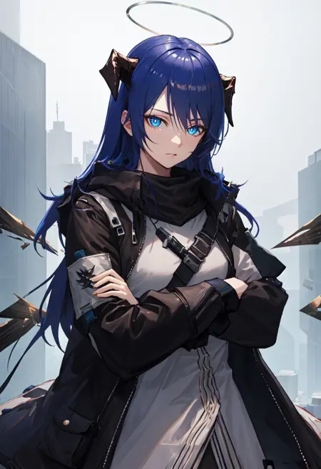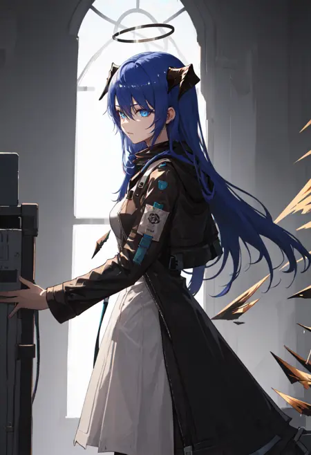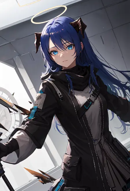 触发词为 mostima_arknights,剪枝标签为 blue_hair, long_hair, horns, blue_eyes, halo, demon_horns, wings, detached_wings, hair_between_eyes。当某些特征(如发色)有时不够稳定时,您可以将这些标签添加到您的提示词中。