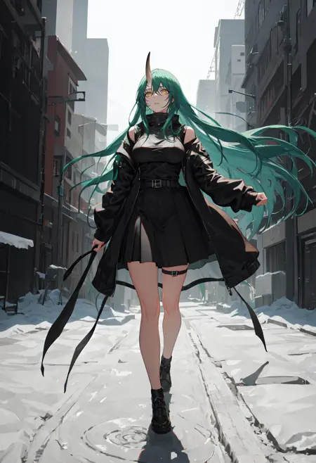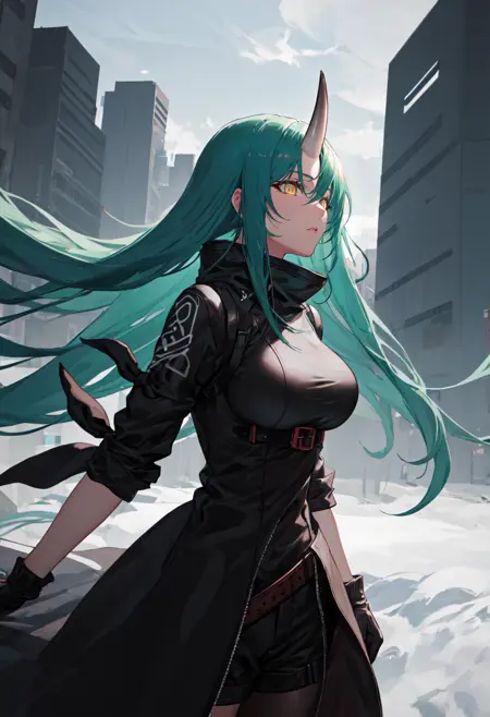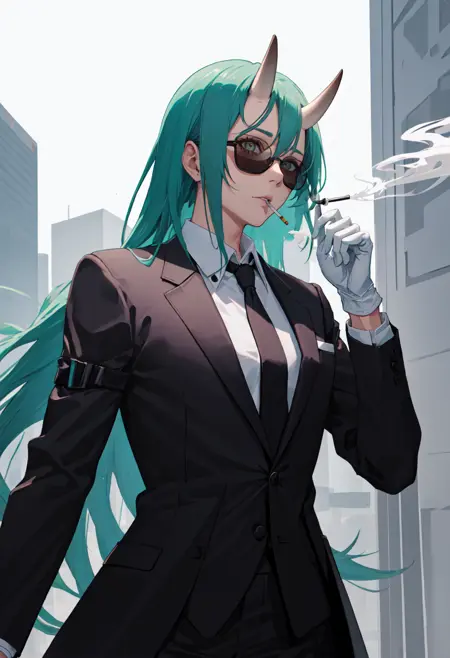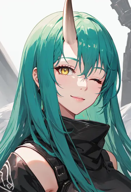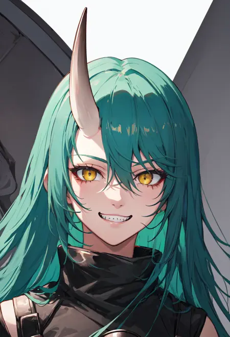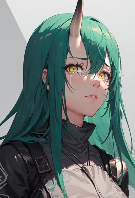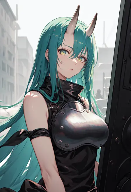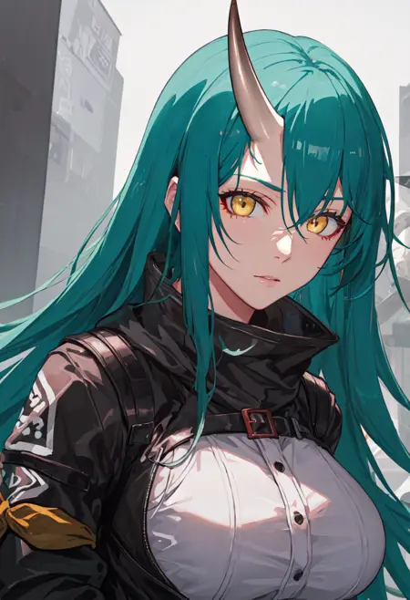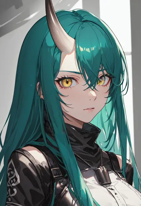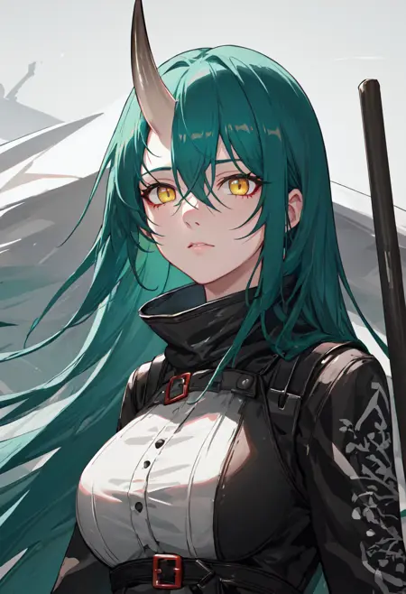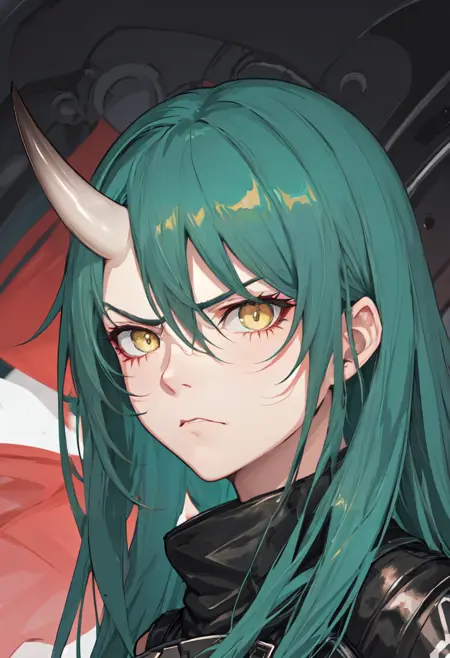 触发词为 hoshiguma_arknights,已修剪的标签为 horns, single_horn, green_hair, long_hair, breasts, yellow_eyes, hair_between_eyes, large_breasts。当某些特征(例如发色)有时不够稳定时,您可在提示词中加入这些标签。