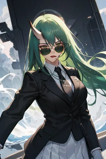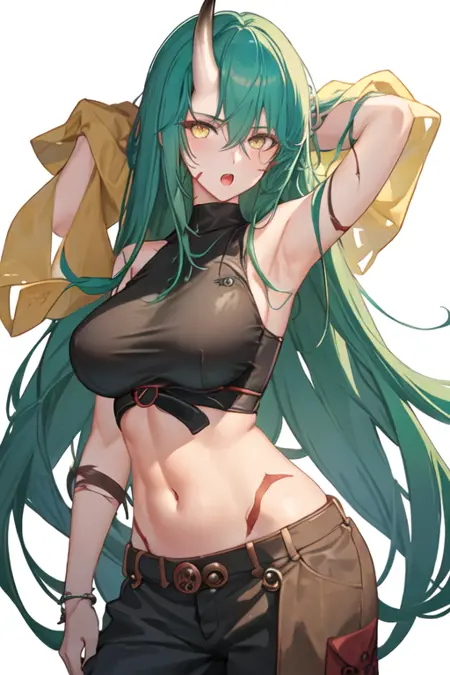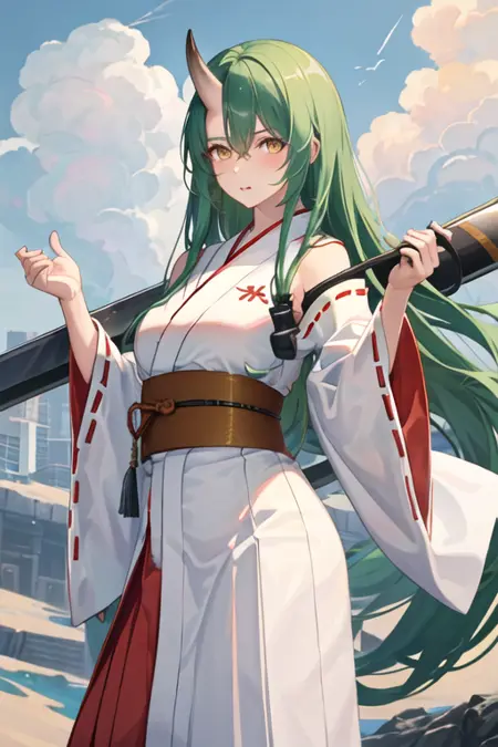 - The pruned character tags are horns, single horn, green hair, long hair, breasts, yellow eyes, hair between eyes, large breasts. You can add them into prompts when core features (e.g. hair color) of character is not so stable.