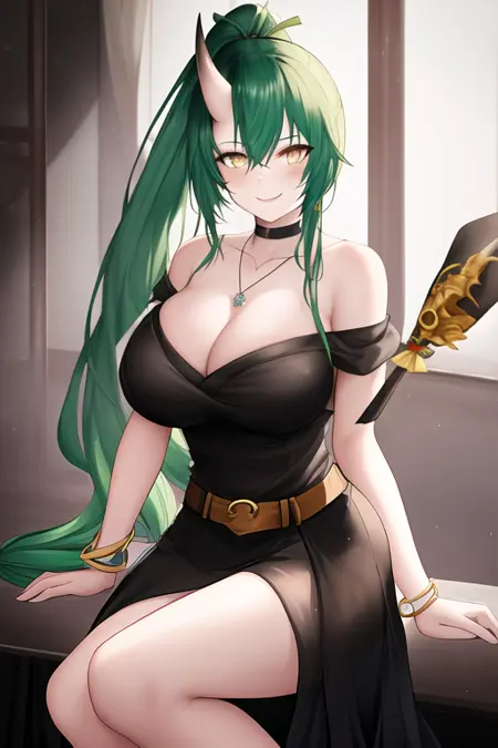 - 축약된 캐릭터 태그는 뿔, 단일 뿔, 녹색 머리카락, 긴 머리카락, 가슴, 노란색 눈, 눈 사이의 머리카락, 큰 가슴입니다. 캐릭터의 핵심 특징(예: 머리카락 색상)이 안정적이지 않을 때 이 태그들을 프롬프트에 추가할 수 있습니다.