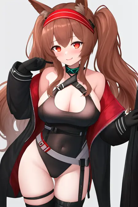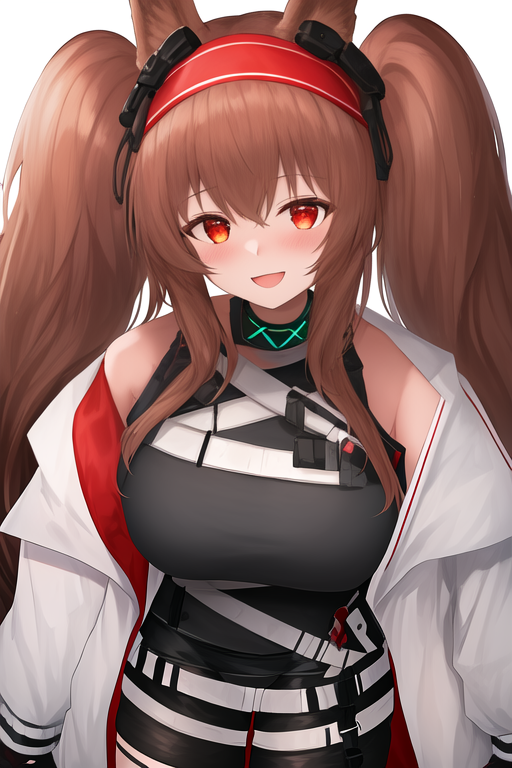 The trigger word is angelina_arknights, and the pruned tags are animal_ears, brown_hair, long_hair, fox_ears, twintails, hairband, red_hairband, red_eyes, breasts. When some features (e.g. hair color) are not so stable at some times, you can add these them into your prompt.