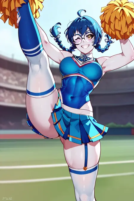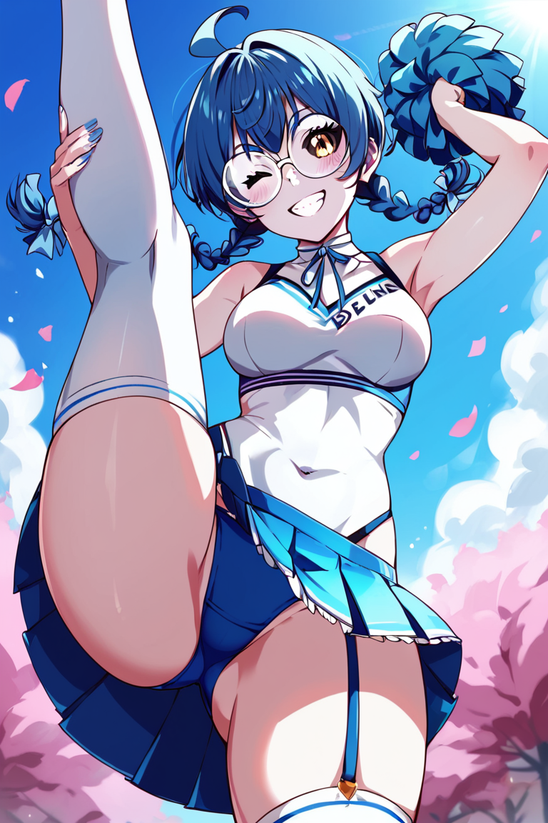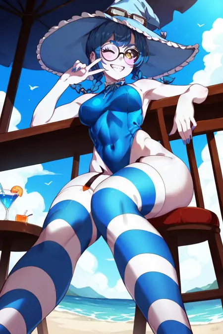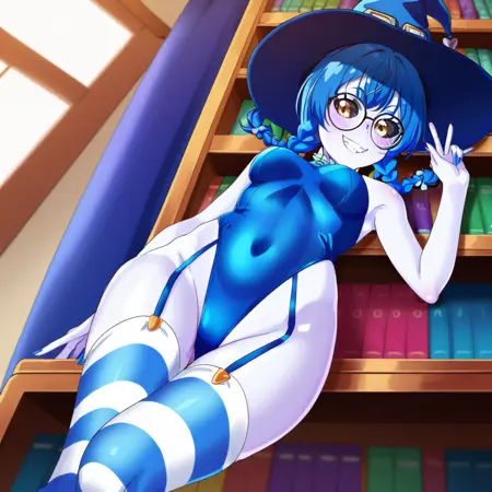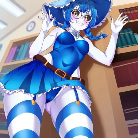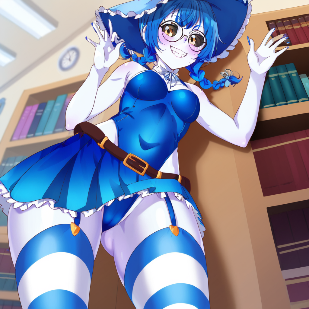 ymqnl, white skin, blue nails, blue hair, twin braids, black sclera, yellow eyes, glasses, witch hat, striped thighhighs, leotard, blue skirt, covered navel